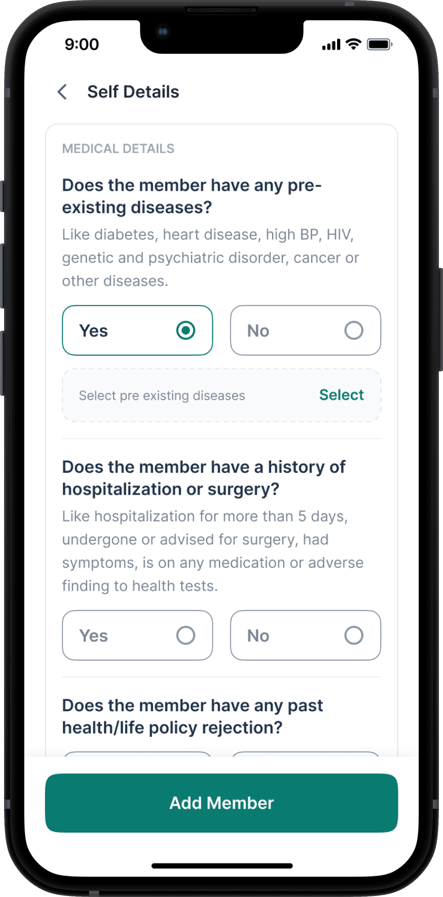 Most other players (like PhonePe or PolicyBazaar) used a rigid 2-step approach: first gather personal info for everyone, then switch to medical history. This creates a high mental load — users must remember what they’ve entered for each person, often jumping back and forth.
